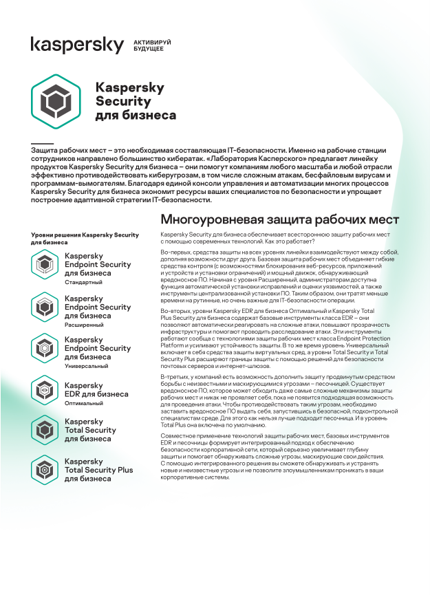 Kaspersky Optimum Security – оптимальное предложение для небольших и средних организаций с базовой ИБ-экспертизой, которое повышает защиту компаний от массовых и более сложных угроз. На выбор, компания получает простое в использовании сочетание продуктов с базовыми возможностями расследования и реагирования на инциденты или может полностью положится на экспертизу «Лаборатории Касперского» и получить круглосуточный мониторинг безопасности. Самым эффективным подходом к безопасности будет совместить эти два подхода собственной и управляемой защиты.